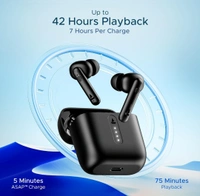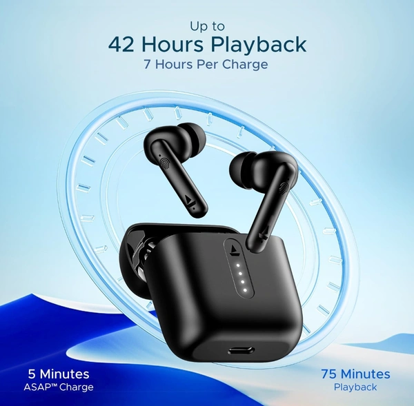 FeaturesPlayback- Enjoy an extended break on weekends with your favourite episodes on stream, virtue of a playback time of up to 42 hours including the 6 hours nonstop playtime for earbuds.Low Latency- Our BEAST mode makes Airdopes 141 a partner in entertainment with real-time audio and low latency experience. These tws earbuds are your companion for a perfect gaming experience.Clear Voice Calls- It dons built-in mic on each earbud along with our ENx Environmental Noise Cancellation tech that ensures a smooth delivery of your voice via voice calls
