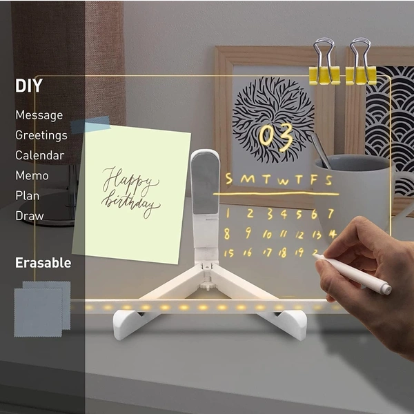 (2 in 1): Message board night light,use modern transparent acrylic,with USB cable.Light is soft,can be used as a night light, children's bedroom bedside lamp.With a stand,it can be stably placed on the desktop,small in size,easy to carry.It is an exquisite home decoration