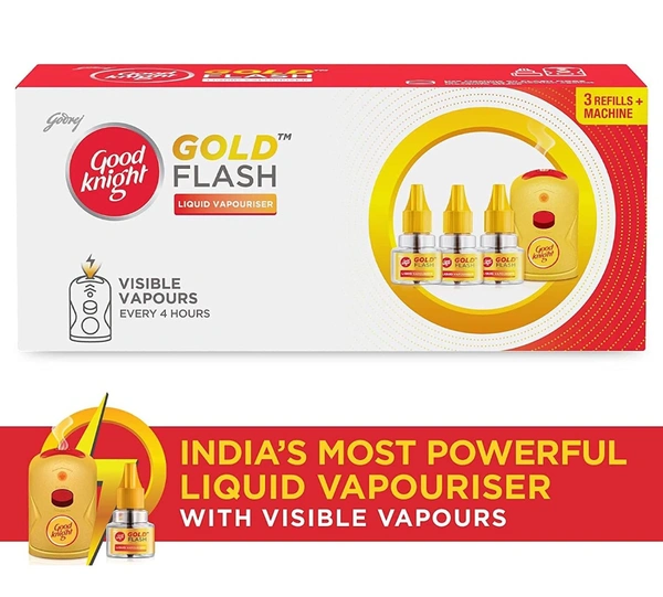 Good Knight Gold Flash Liquid Vapourizer | Mosquito Repellent Combo Pack | Machine + Pack Of 3 Refills (45Ml Each)