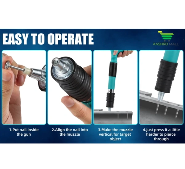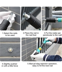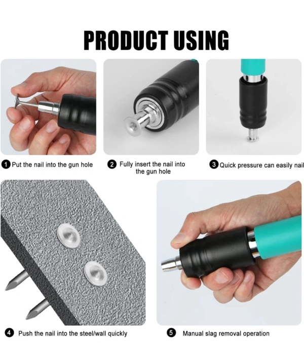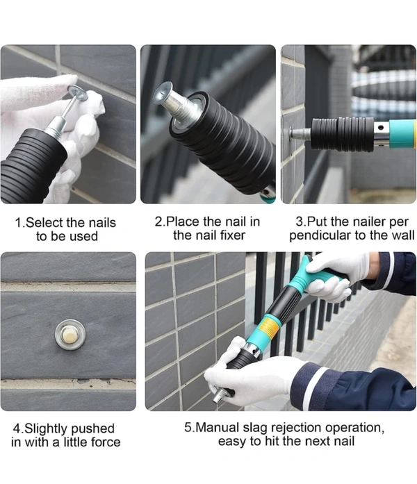 --- Easy to use: just five simple steps: 1, wear protective glasses, gloves and hearing protection 2, choose the right nail in the nail tube 3, nail gun perpendicular to the workplace ready to shoot 4, vertical force into the wall 5, back-soft slag operation, hold the silencer sleeve with your hand, reverse compression several times to soften slack.